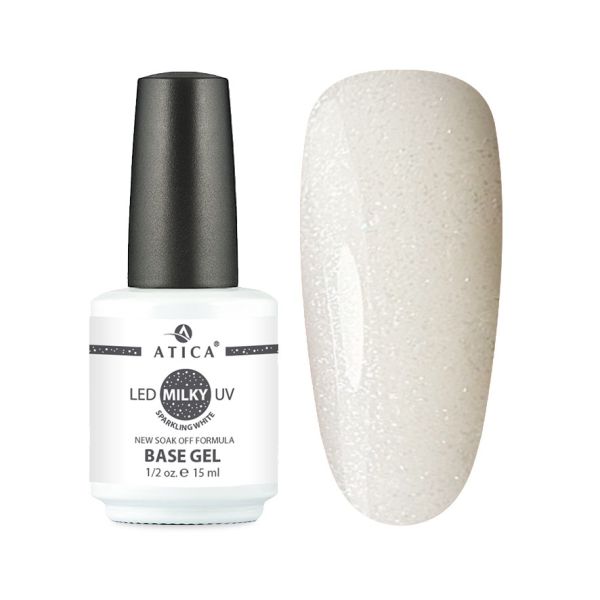 Молочна база з шимером- для тих, хто полюбляє ніжний молочний манікюр, а також для власниць слабкої нігтьової пластини. Завдяки дрібним волокнам, база виконує армування, зміцнюючи нігтьову пластину, вибудовує міцний каркас, працює як стабілізатор кольору (подфоновка для кольорів).
